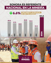 El gobernador Durazo celebró este logro del 6.6% de crecimiento en este rubro, en el que la entidad contribuye significativamente a la producción de minerales a nivel nacional, ya que las gestiones que el Gobierno de Sonora ha realizado con la Presidencia de la República, en colaboración con el sector minero, han tenido un impacto positivo en la entidad.
